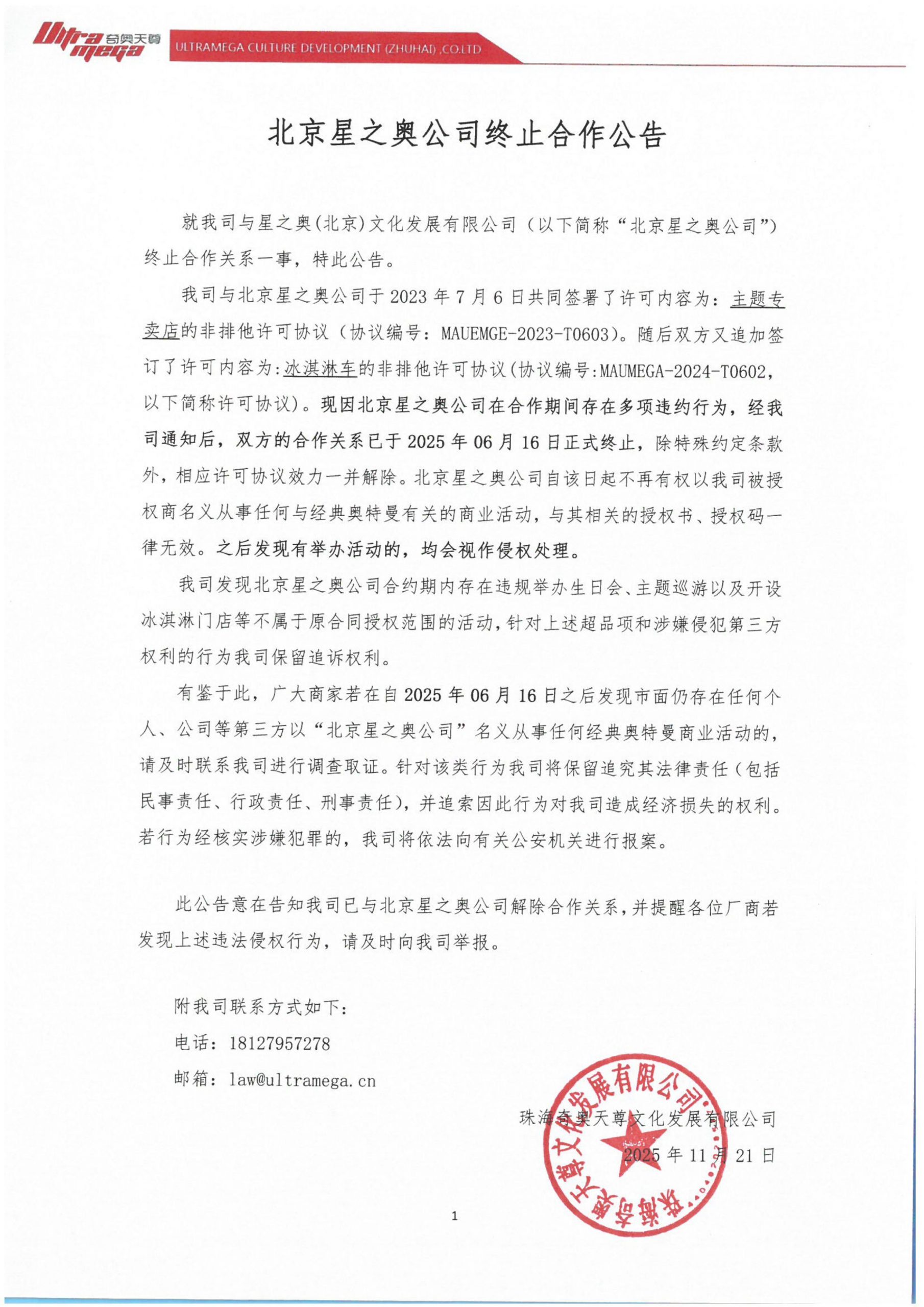 现因星之奥(北京)文化发展有限公司在合作期间存在多项违约行为,经我司通知后,双方的合作关系已于2025年06月16日正式终止。